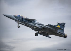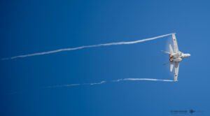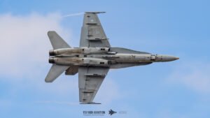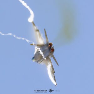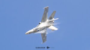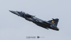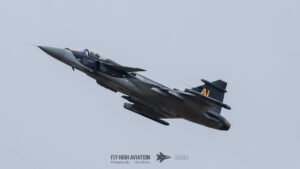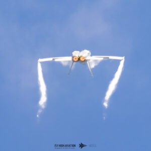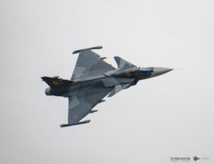 The sole Gripen in the flying program was SAAB’s JAS‑39E demonstration. The jet’s crisp routine was complemented by its bold three-tone splinter camouflage, which gave it a distinctly more commanding and aggressive look. The bold scheme and dynamic angles made for superb photo opportunities, especially during high‑energy passes and tight turns.