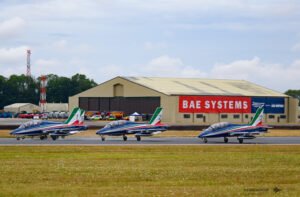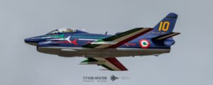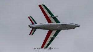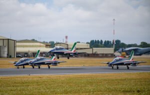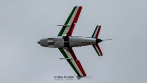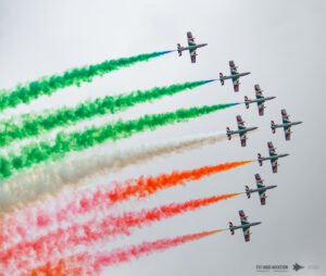 2025 marked the 65th anniversary of the Italian Air Force display team, Il Frecce Tricolori. After a difficult year that saw at least three aircraft damaged in an incident, the team made one of only two international appearances of the season at RIAT flying a nine‑ship formation. Despite the reduced number and a noticeably restrained commentary, the display retained all its color and spectacle, delivering the precision and visual drama the team is known for.