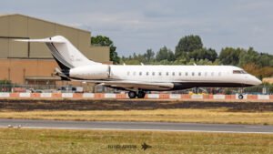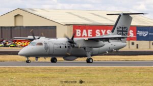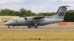A UK Government Dash 8 arrived for the static display, its clean lines and distinctive scheme adding interest to the showground. Though not part of the flying programme, it offered a rare chance to see this utility aircraft up close.