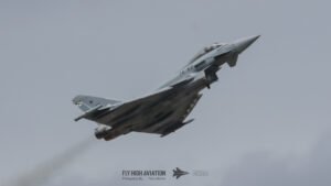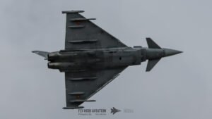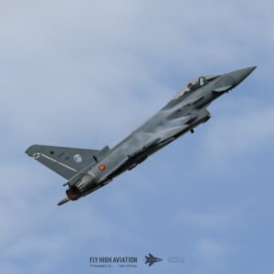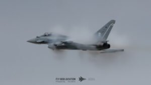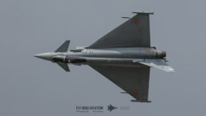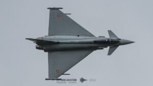The Spanish Air Force Eurofighter C.16 Tifon (Typhoon) cut through the dark skies with compact, high‑G turns, the airframe shedding crisp vapor on each hard radius maneuver. The distinct silhouette of the jet against the low cloud enhanced both its photographic geometry and operational clarity.