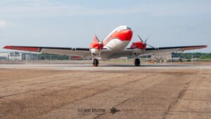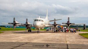 The ground exhibitions offered visitors an immediate sense of scale and variety as they stepped onto the base, with aircraft thoughtfully spaced to allow clear viewing and photography while keeping the flow of people comfortable. Food vendors and merchandise stalls were positioned throughout the static area, giving families and enthusiasts plenty of options and ensuring no one went home without a souvenir of the day. The static lineup drew heavily from Pax River’s own operational and test units, showcasing the breadth of work carried out on the station. Among the highlights were the P‑8 Poseidon and the imposing RQ‑4 Global Hawk from VX‑20, positioned near the hangars. HX‑21 “Blackjack” contributed an MV‑22 Osprey, while their rotary‑wing contingent included two MH‑60 Sea Hawks, a UH‑1Y Venom, and an AH‑1Z Viper, each representing a different facet of naval and Marine Corps aviation. A particularly eye‑catching presence was the P‑3 Orion marked for the Naval Research Laboratory, presented in immaculate condition. One of the most consistently popular attractions was the F‑35C test aircraft, drawing steady crowds throughout the day. Adding a distinctive civilian touch to the lineup was a turbine‑powered DC‑3, a rare and welcome sight that complemented the military displays and underscored the diversity of aviation represented at the show.