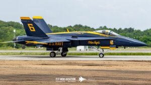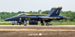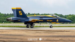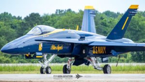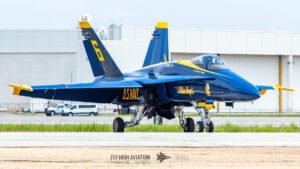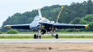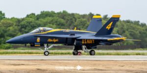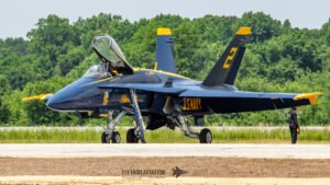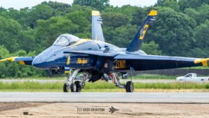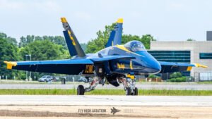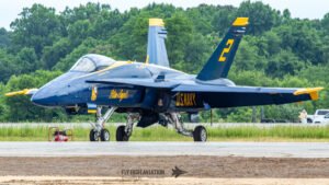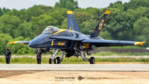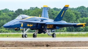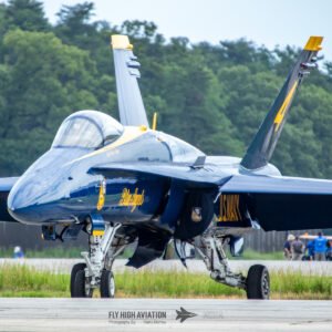 The Blue Angels’ aircraft were positioned near the runway, set back from public access but clearly visible, giving spectators an excellent opportunity to capture clean, unobstructed images. Their distinctive blue‑and‑gold jets stood out across the airfield, adding a strong visual highlight to the static displays even before the team took to the air.