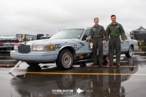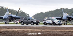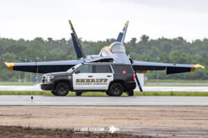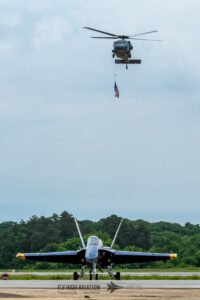 The opening ceremony set a strong and dignified start to the weekend, beginning with emergency medical services, local law enforcement, and base security moving into position along the runway in a coordinated display of unity and service. Their presence created a striking visual line as the national anthem was performed, a moment that brought the crowd together and highlighted the close partnership between NAS Patuxent River and the surrounding communities. The ceremony then transitioned into a brief missing man tribute, performed by Rob Holland, Bill Stein & Patty Wagstaff, in memory of Skytyper’s team member Ken Johansen, the celebratory spirit of the day. The combination of precision, professionalism, and symbolism made the opening ceremony a memorable introduction to the events that followed.