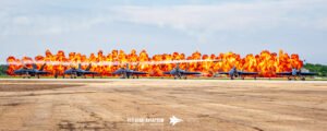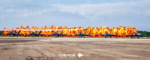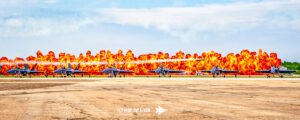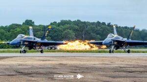 That moment became one of the most unforgettable visuals of the entire show: the Blue Angels parked in the foreground, perfectly still and gleaming in the sun, while Rob Holland and Shockwave tore across the runway in a head‑to‑head race framed by an enormous wall of fire. The contrast was stunning—precision Navy jets at rest, an aerobatic master at full throttle, and a jet‑powered truck blasting forward with flames and thunder. The heat, the noise, the timing, and the sheer spectacle all came together in a single, breathtaking pass that felt larger than life. It was the kind of moment that reminds you why airshows are pure sensory overload in the best possible way.