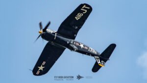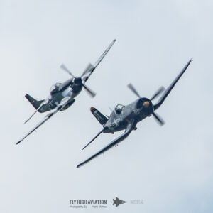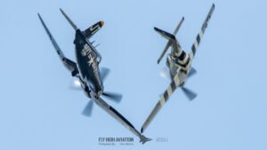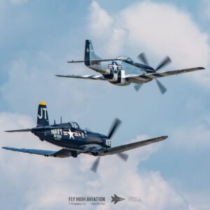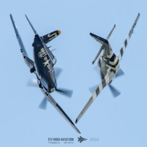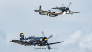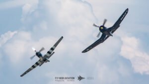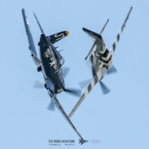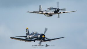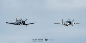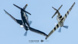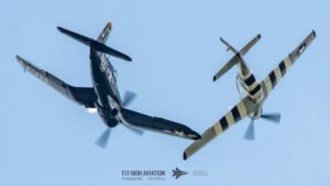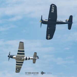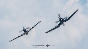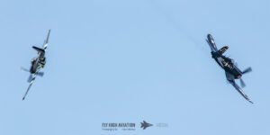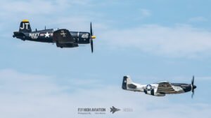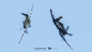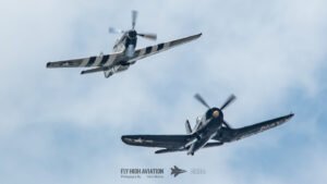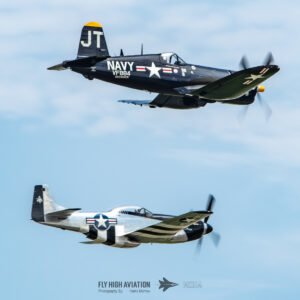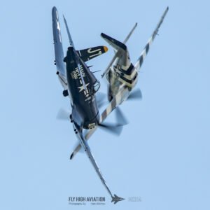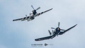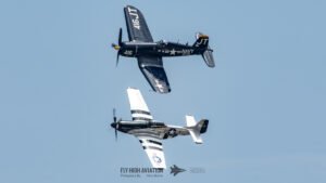 The show shifted into a rare and nostalgic moment when the F‑4U Corsair flown by Jim “Torque” Tobul was joined by Scott Yoak’s P‑51 Mustang Quicksilver for their combined routine, Class of ’45. Seeing these two iconic American fighters from the final year of World War II flying together created a powerful visual and emotional highlight. The deep rumble of the Corsair’s radial engine paired with the Mustang’s smooth Merlin growl made for an unforgettable soundscape, while their formation passes showcased the contrasting lines and personalities of the two aircraft. It was a beautifully executed tribute to the closing chapter of WWII aviation and a reminder of the engineering and bravery that defined that era.