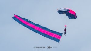 The Misty Blues delivered a clean, uplifting performance as the all‑female parachute team opened their jump over the field. Their descent was smooth and well‑timed, canopies blossoming overhead as they touched down with the precision and confidence that have made them a favorite at shows nationwide. It was a sharp, energetic addition to the early program and a strong showcase of their skill.
