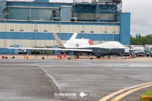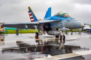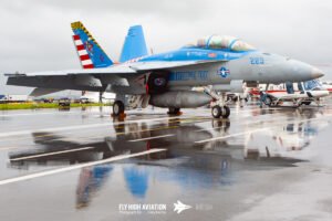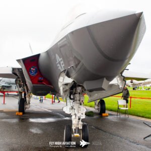 The first of the three static sections had a character all its own. The heavy rain that washed out the flying actually created something visually striking on the ground. Water pooled across the ramp and turned the tarmac into a mirror, giving the aircraft a dramatic set of reflections you rarely get to see. These machines, normally viewed in the context of their test missions at Pax River, suddenly looked almost theatrical—bright markings doubled beneath them, navigation lights shimmering across the wet surface, and every contour of their airframes outlined by the sheen of standing water. Instead of hiding the aircraft, the weather revealed them in a new way, turning a grey, difficult day into an opportunity to appreciate these test platforms from a more artistic angle.